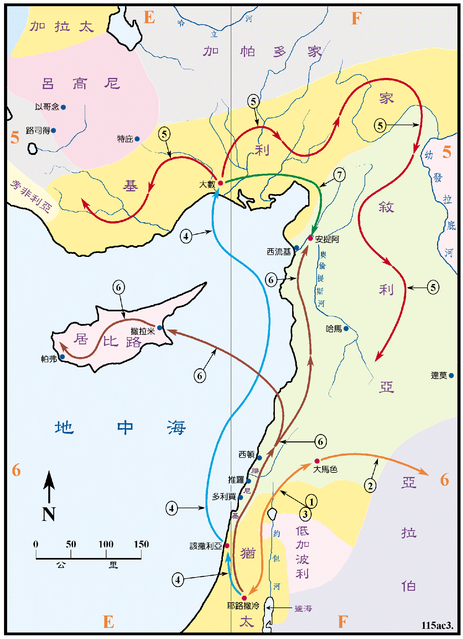 有些四散的门徒没有停在犹太和撒马利亚,他们一直走到腓尼基和居比路(塞浦路斯)并安提阿。这些是什么地方?(看图一)