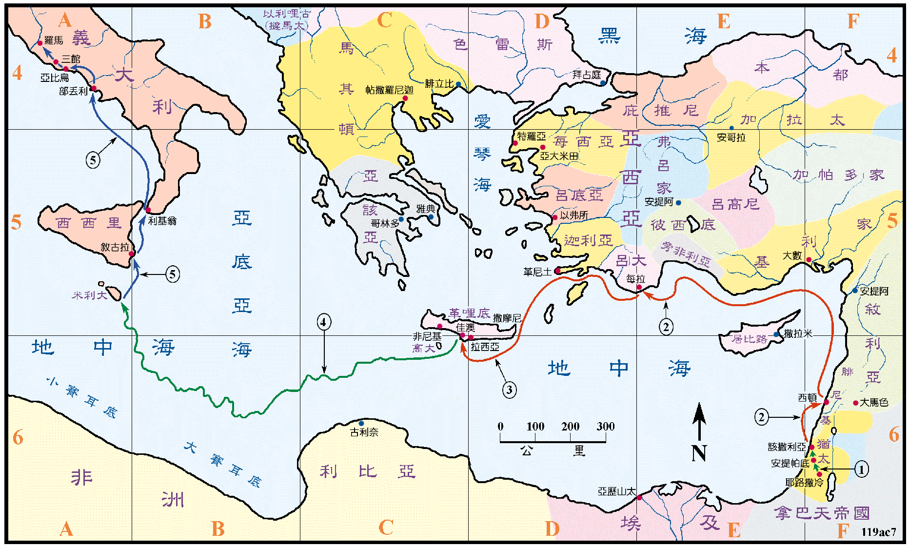 请大家参考图一,船只先来到叙拉古(Syracuse),这是在西西里的主要港口,离开马耳他有80哩。逗留了三天后,就启航往利基翁(Rhegium),因着南风的吹送,只花了一天就抵达 182哩外的部丢利(Puteoli),这是罗马的主要港口,离开罗马 130哩。