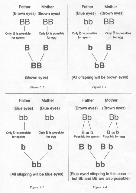 Remember that a sperm from a man, or an egg from a woman, can carry only one half of any pair - if a man's code in relation to his eye color is Bb, then his sperm can carry either b or B. So in Figure 5, we see how eye color can be inherited.