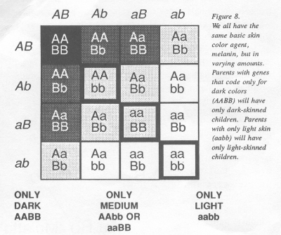 What would happen, by using a punnet square, It two such mid-brown mulatto people were to marry (the shading of the squares roughly indicates the resultant skin color)? (Figure 8.)